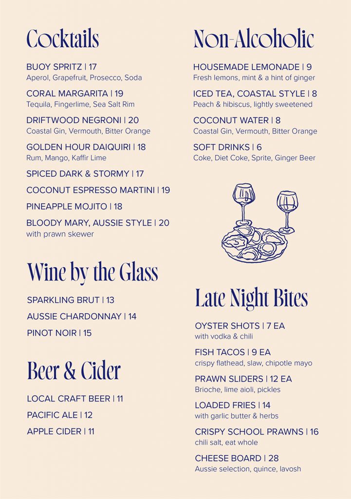 Das Design verbindet Küstencharme mit einem modernen, charakterstarken Markenauftritt. Inspiration fanden die Farben im blauen Meer, warmem Sand und dem Orange-Rosa von Korallen und Garnelen. Die Palette spielt mit Kontrasten und schafft eine Balance zwischen Eleganz und Nahbarkeit.